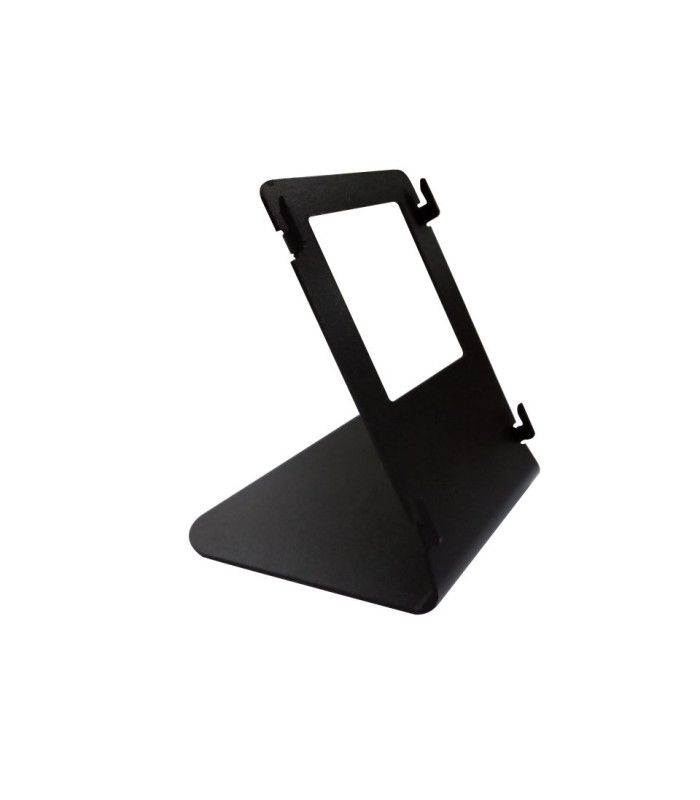 Unlike the slim C-clips used for wall mounting, this stand is a substantial steel bracket that provides a stable, ergonomic viewing angle for reception desks, office workstations, or bedside tables.