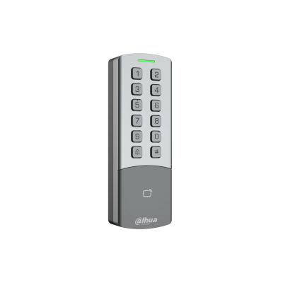 The Dahua ASI1201M-MEP is a standalone access control reader combining card and password authentication. It supports up to 10,000 users, 100,000 event records, and includes features like online web configuration, alarms (tamper, duress, intrusion), multi-factor verification, PoE, and robust IP65 / IK08 protection