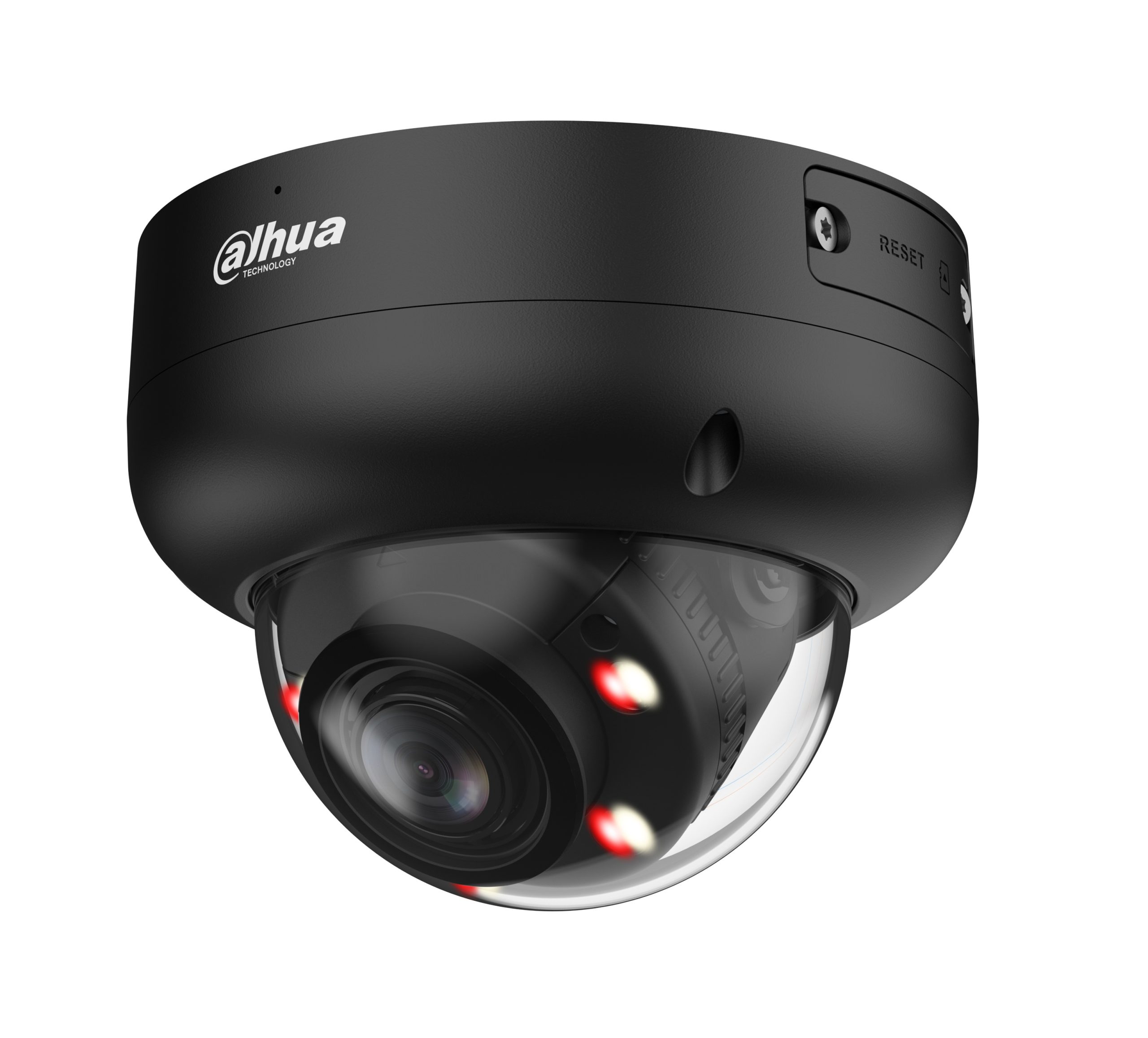 8-megapixel (4K) dome network camera with motorised vari-focal lens, dual light (warm & IR) for colour or black & white at night, high sensitivity, advanced AI functions (people/vehicle classification, perimeter protection), rugged IP67 / IK10 casing, and wide environmental tolerance. THIS IS THE BLACK VERSION. DHU7589_DH-IPC-HDBW3867R-ZAS-IL-ANZ-BLK_family-datasheet_1