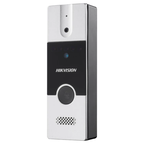 The DS-KB2411T-IM is a 4-wire door station that connects to the HIK-KH6320-WTDE1 hybrid room station. It does not require a power supply as the hybrid room station provides power and includes relay output to release a door.