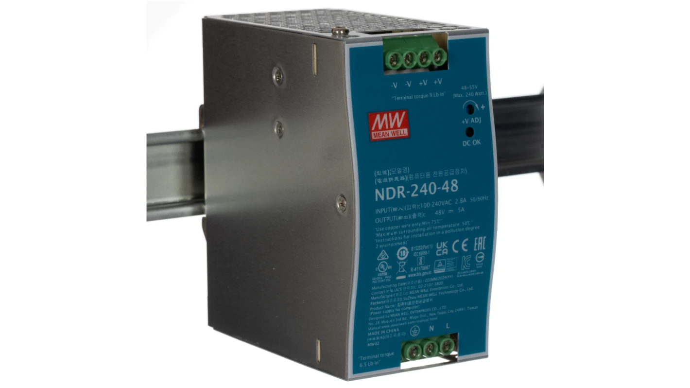 Mean Well offers several models for a 48V DC, 5A (240W) DIN rail power supply, each tailored for different industrial needs. The most common options are the economical NDR series, the slim and high-efficiency SDR series, and the low-cost EDR series.