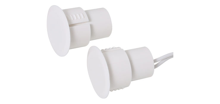 Magnetic reed switches use no glue or screws to mount. Small protrusions hold the contact in place. Use indoors or outdoors for an attractive recessed installation.