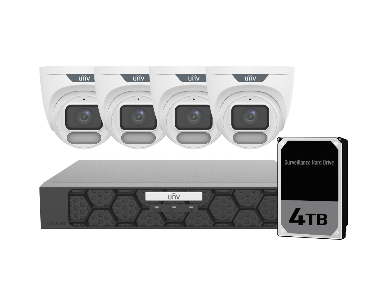 Acutrack Owlview Package includes: 4 x IPC3626LE-ADF28K-WP, 1 x NVR501-08B-P8-IQ, 1 x 4TB HDD installed