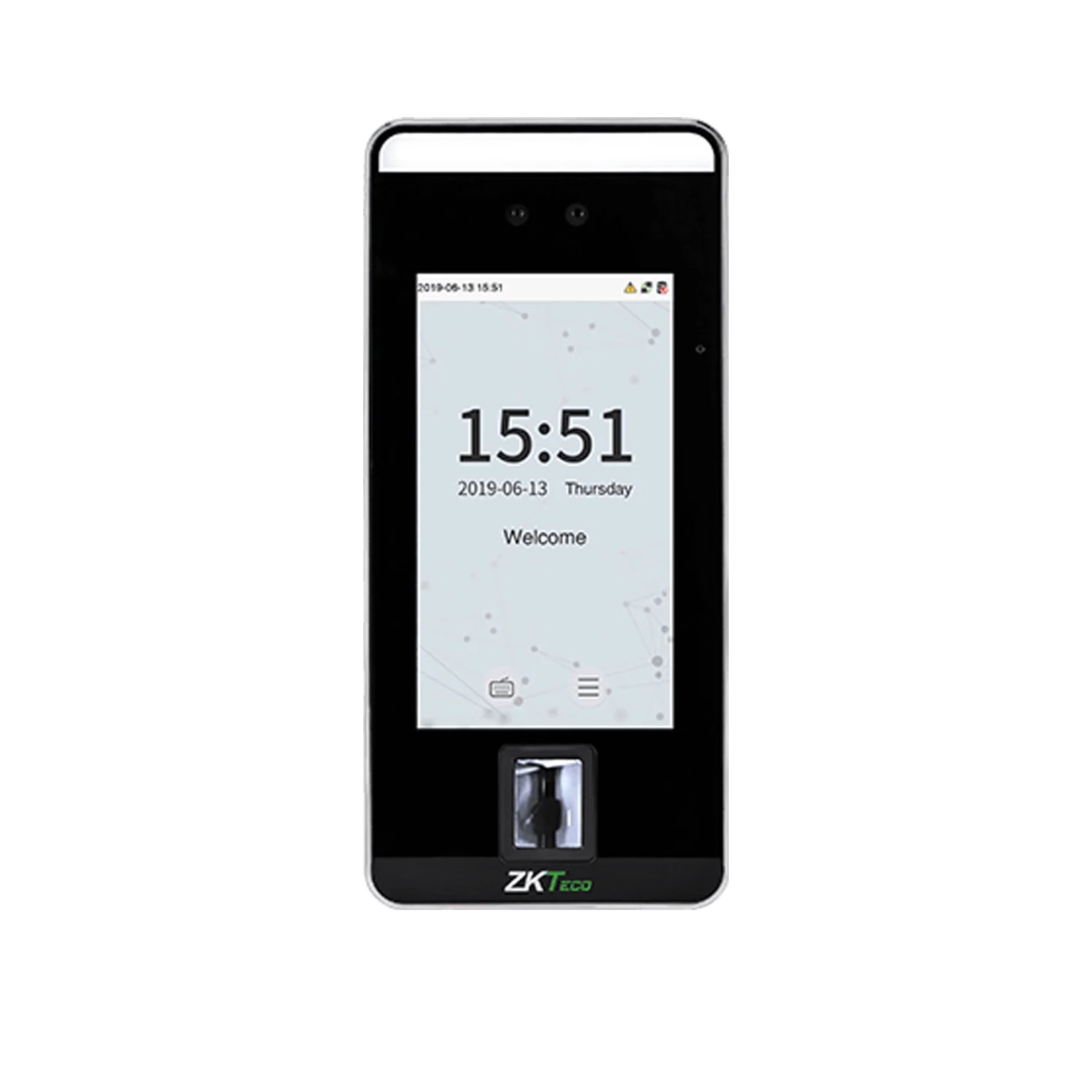 The ZKTeco SpeedFace-V5L is a Linux-based hybrid biometric terminal designed for time attendance and access control, featuring visible light facial recognition technology. It offers multiple verification methods, including face, fingerprint, card, and password, accommodating diverse security requirements. The device boasts a 5-inch touch screen and supports up to 6,000 face templates, 6,000 fingerprints, and 10,000 cards, ensuring scalability for various organizational needs. Equipped with an anti-spoofing algorithm, it effectively defends against print attacks (laser, color, and black-and-white photos), video attacks, and 3D mask attacks. The terminal also provides supplementary lighting with adjustable brightness to enhance facial recognition accuracy in different lighting conditions.